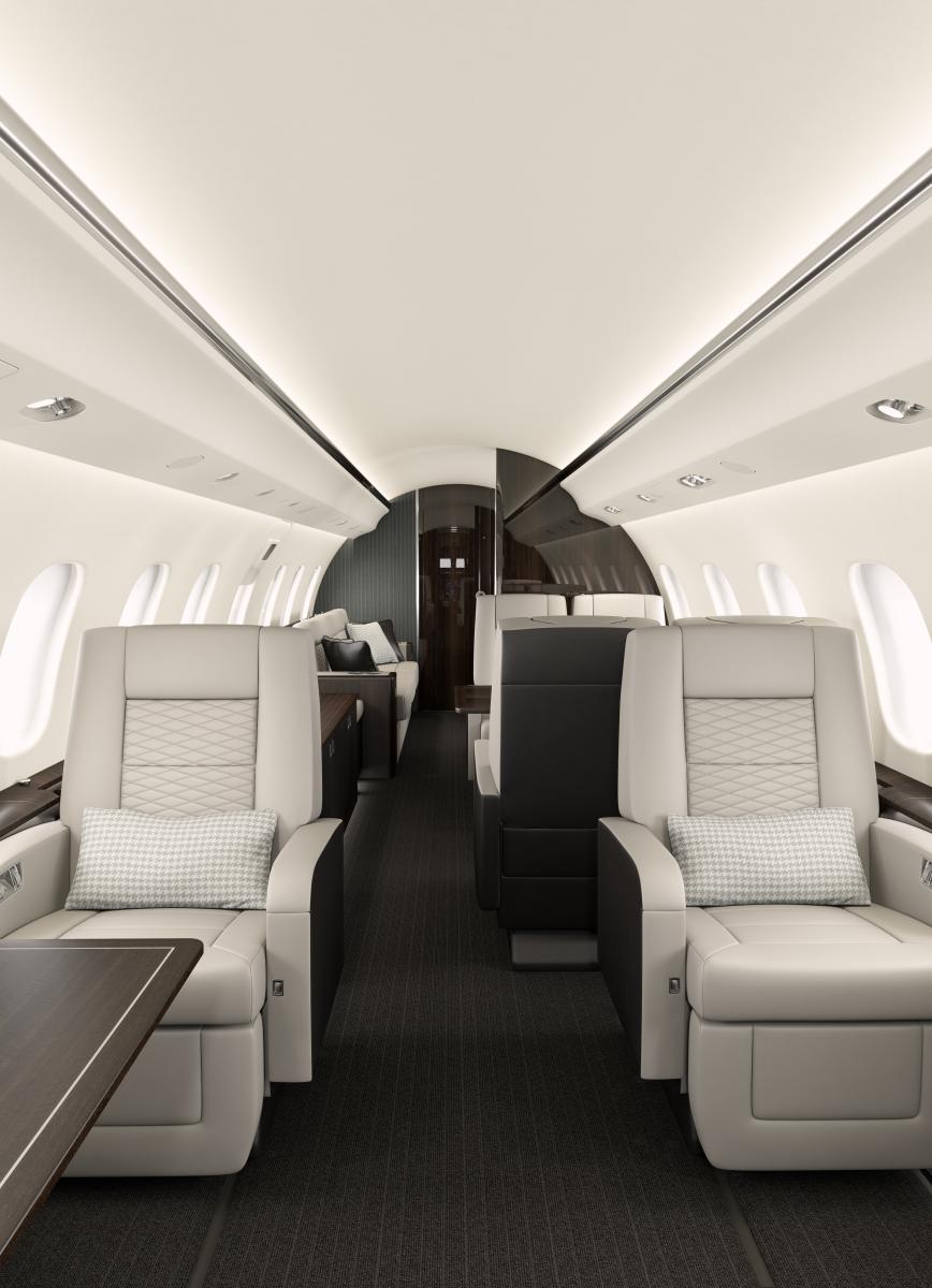 Flexible seating configurations allow between thirteen and nineteen passengers, and the cabin can be divided into thirds for increased privacy. There are two fully-enclosed lavatories available in the cabin, one of which may be equipped with a shower. The cabin is one the most flexible and elegantly appointed of any business aircraft, offering 27 large windows with natural light, a 100 percent fresh-air system, and a low cabin altitude to help reduce fatigue on long flights.