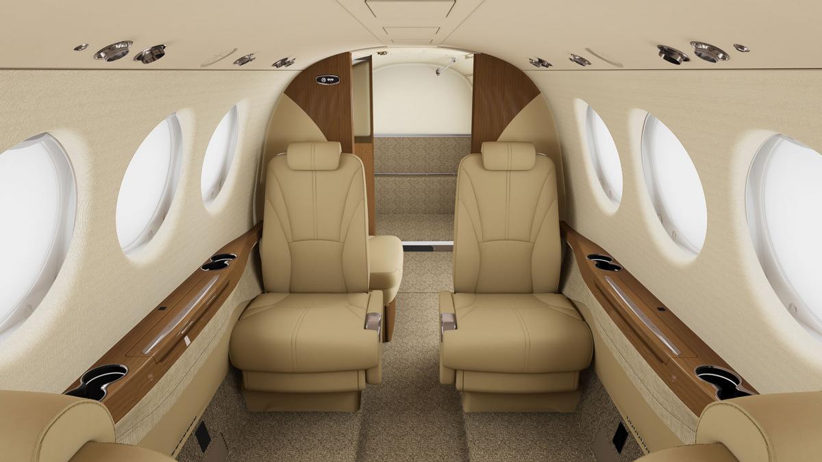 The cabin received a modern make over, with 6 new seats in club configuration that track, recline, and swivel, as well as reshaped cabinetry and sidewalls, and lighting improvements.